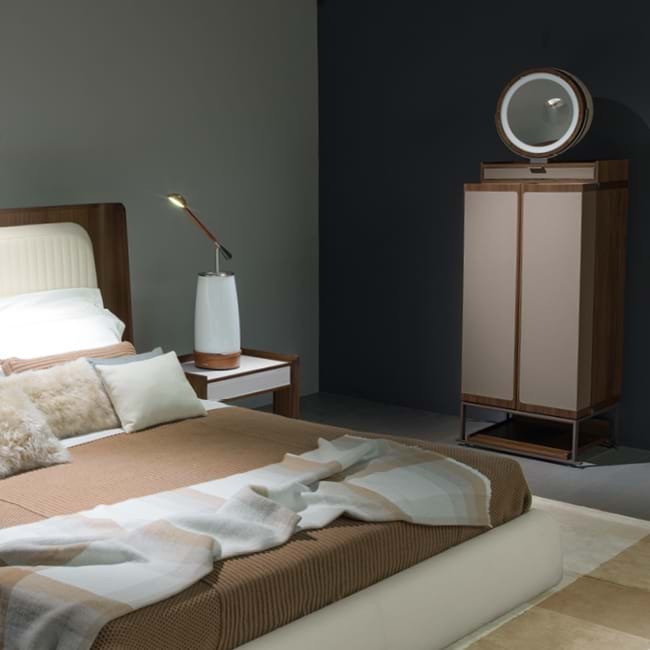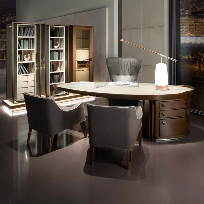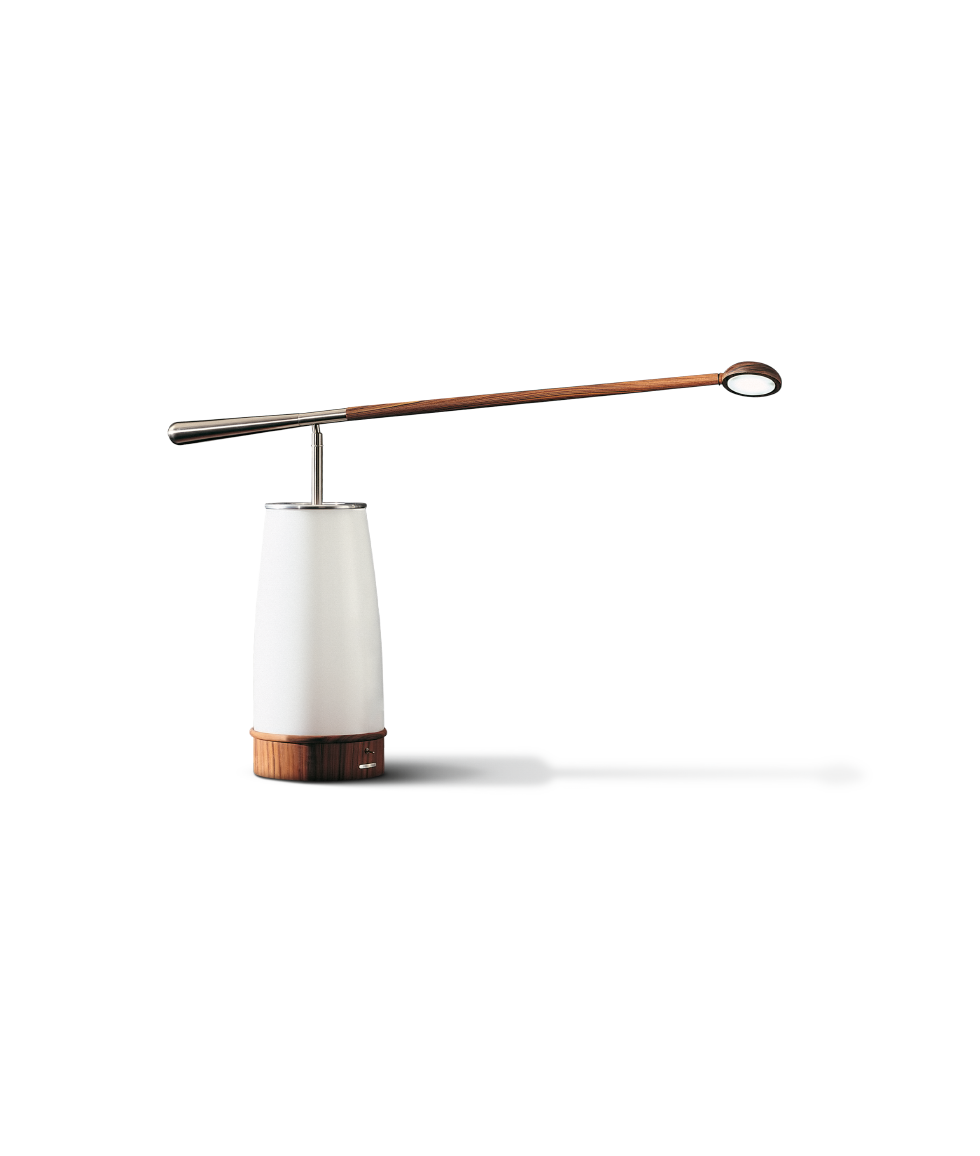 Стол и настольная лампа с конструкцией из массива полированного pau ferro и металла.