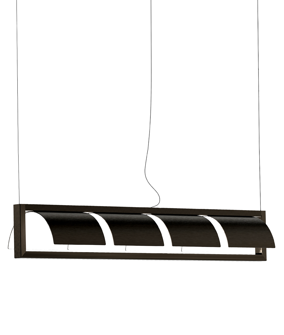 Настенная и подвесная лампы с конструкцией из латуни и параболическими элементами из металла или сатинированного стекла.