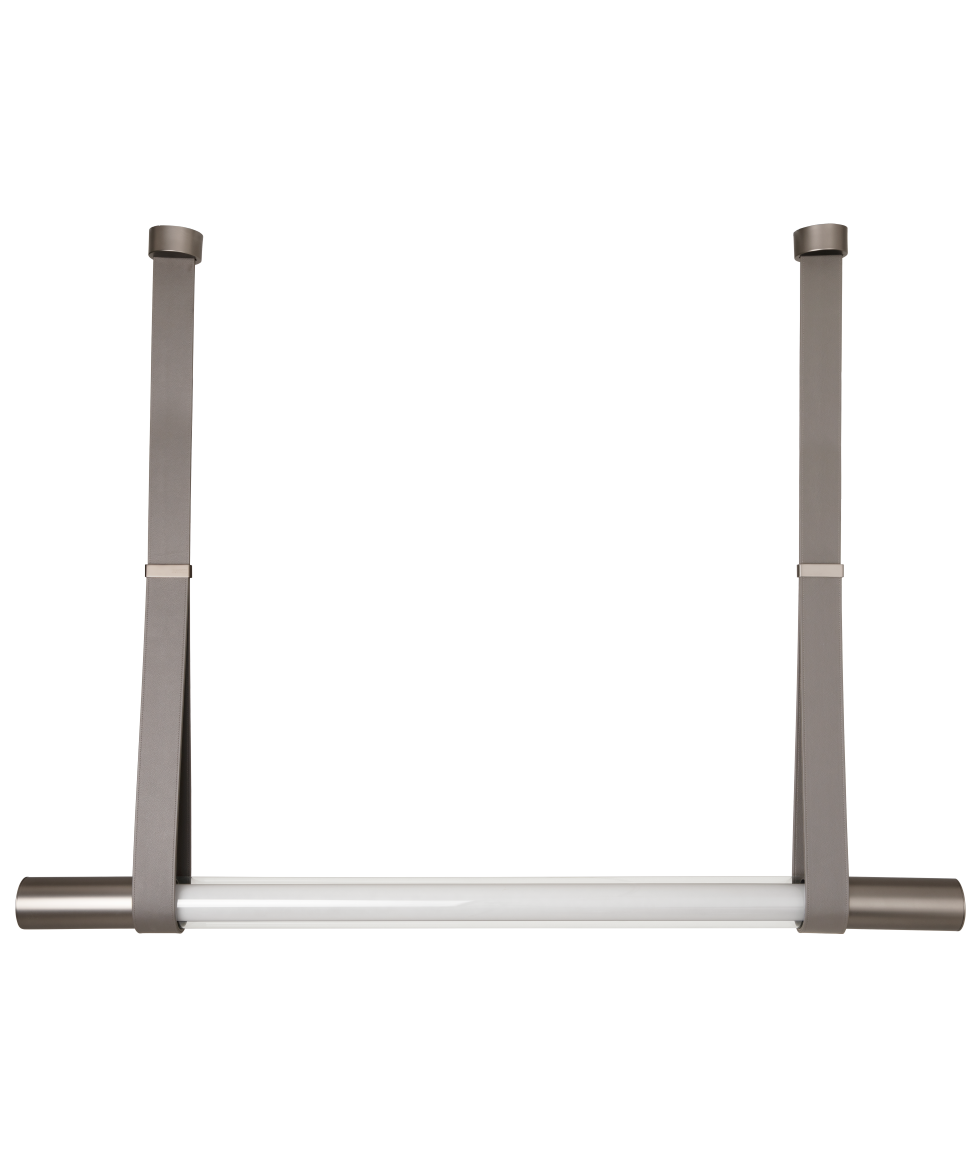 Подвесная лампа с трубчатым диффузором, подвешенным на кожаных ремнях трёх цветов: порошкового, антрацитового и топленого.