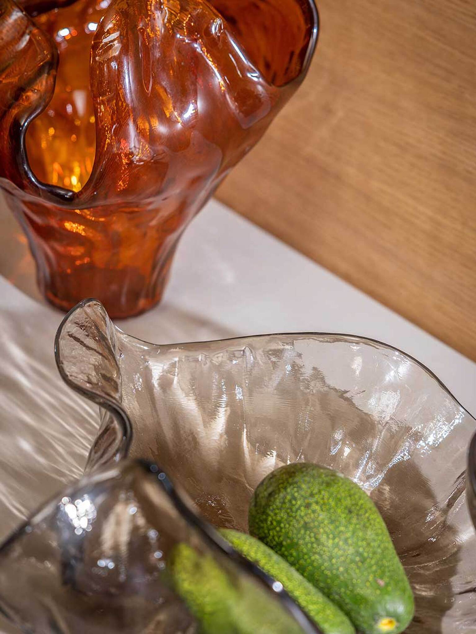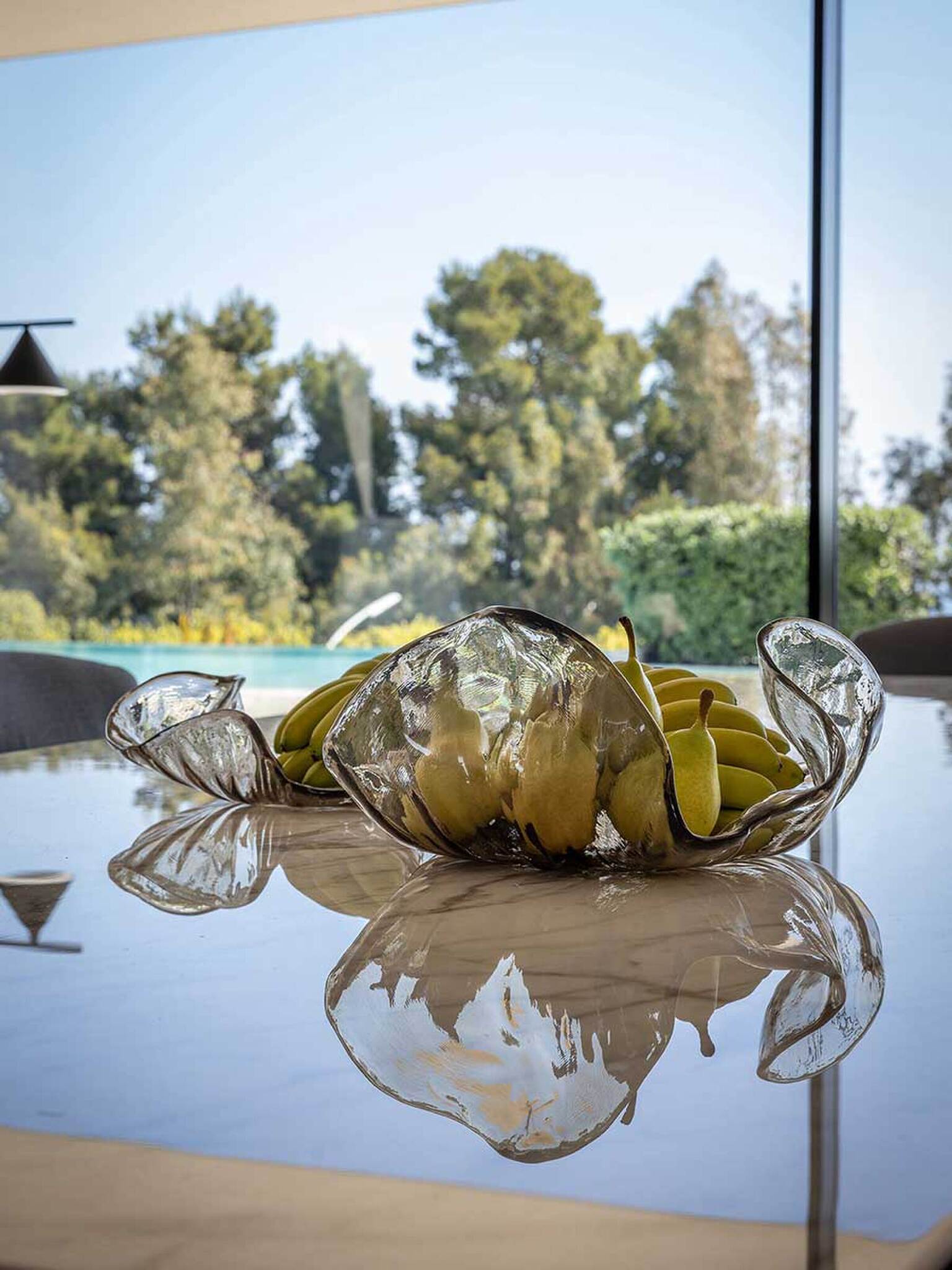 Серия Water Illusion полностью изготовлена вручную в Италии с использованием 100% переработанного стекла и сложной технологии литья стекла - особого процесса, при котором хрусталь и "котиссо", переработанное стекло, плавятся в тиглях при температуре до 1500С. Стекло толстое и прозрачное, поверхность гладкая, но с внутренней рябью, которая придает ему "волнистую" текстуру, как у воды. Чаши и вазы представлены в двух размерах и трех цветах пасты каждая, что позволяет создавать радужные и поэтичные оттенки на горизонтальных поверхностях.